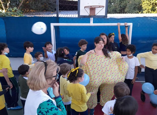 Fazemos gincanas de acordo com cada faixa etária. Crianças e funcionaram veem vestidos da cor da equipe.